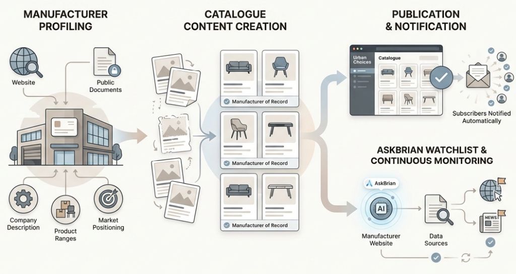 In parallel, the manufacturer’s website and other relevant public data sources are added to AskBrian’s Watchlist. These sources are monitored daily, and any newly published or updated content is flagged for review and potential inclusion.