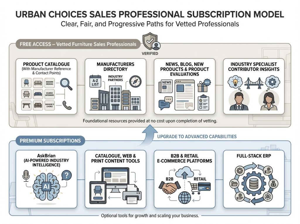 Urban Choices provides its core product information framework as a free foundational tool for vetted furniture sales professionals. This foundation is supplied at no cost to subscribers and is intended to support and enable effective, consistent sales activity.
