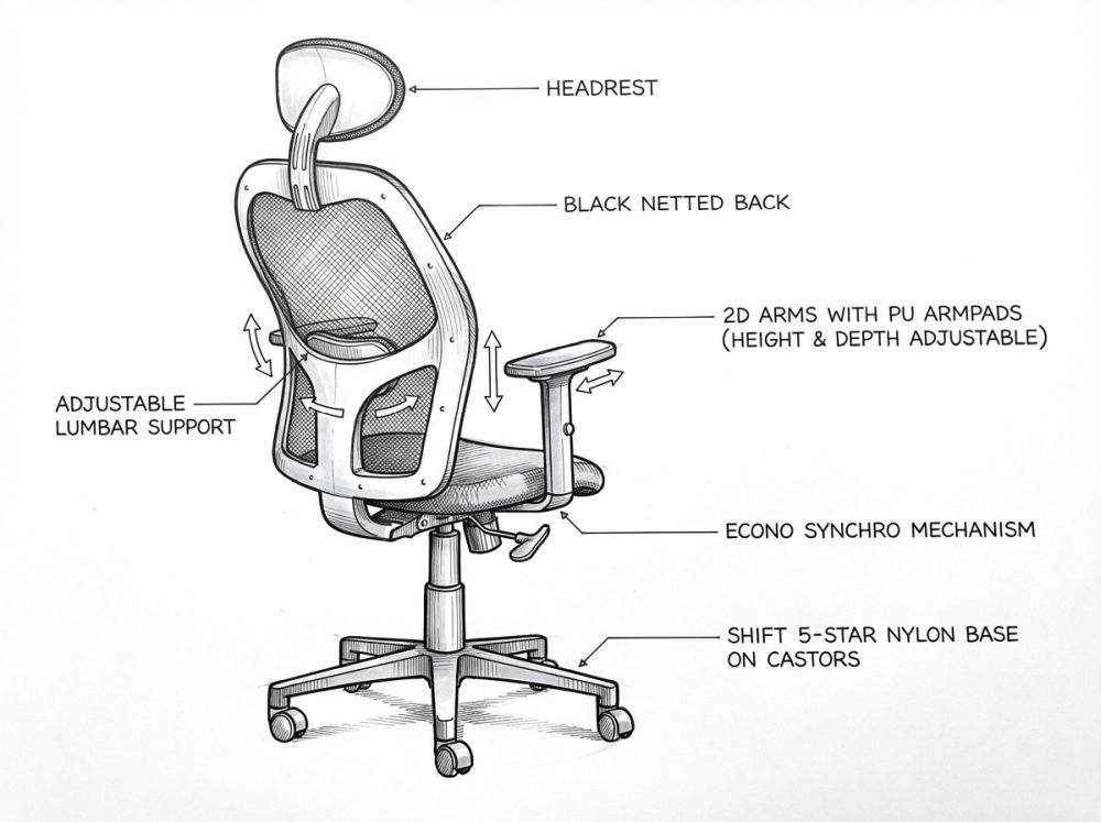 The 9 to 5 range is engineered for dependable performance in commercial environments. Its netted back reduces maintenance, while modular components allow dealers and project teams to adapt the chair to both budget and aesthetic needs.