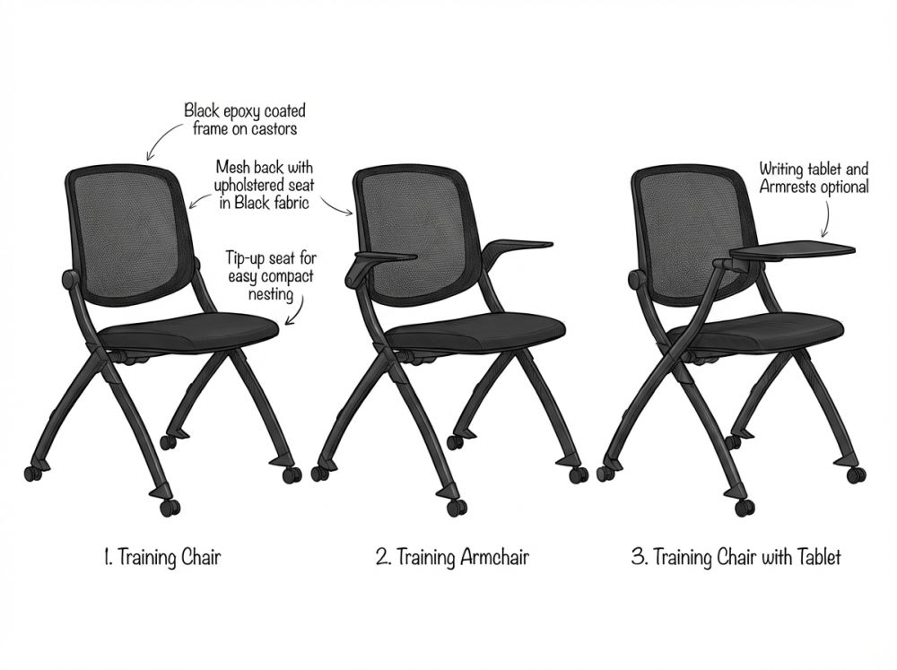 Training room chair comprising Black epoxy coated frame on castors, mesh back with upholstered seat in Black fabric. Tip-up seat for easy compact nesting. Writing tablet and Armrests optional.