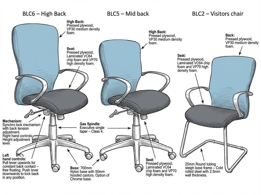 | Chair Type | High Back, Mid Back, Visitors |