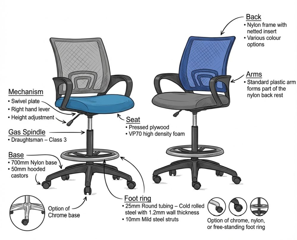 Base: 700mm Nylon base with 50mm hooded castors. Option of Chrome base.