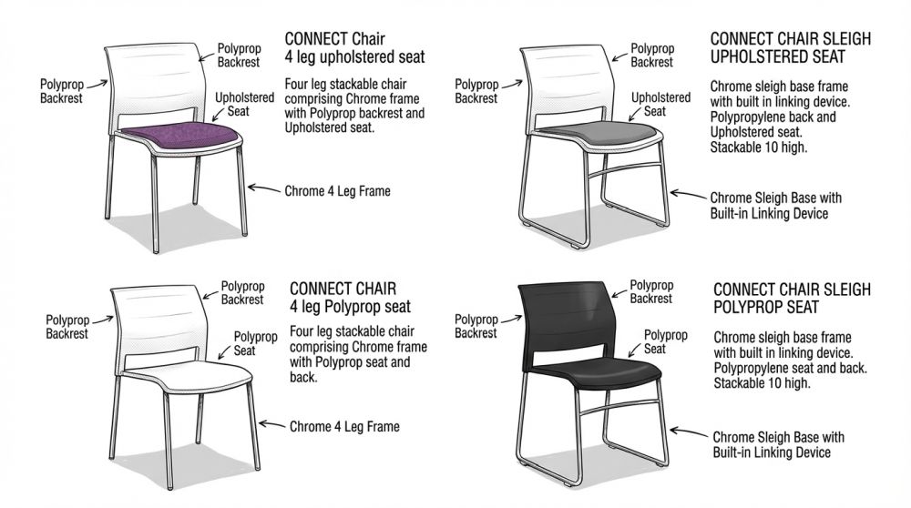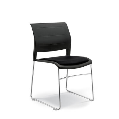 Chrome sleigh base frame with built in linking device. Polypropylene back and Upholstered seat. Stackable 10 high.