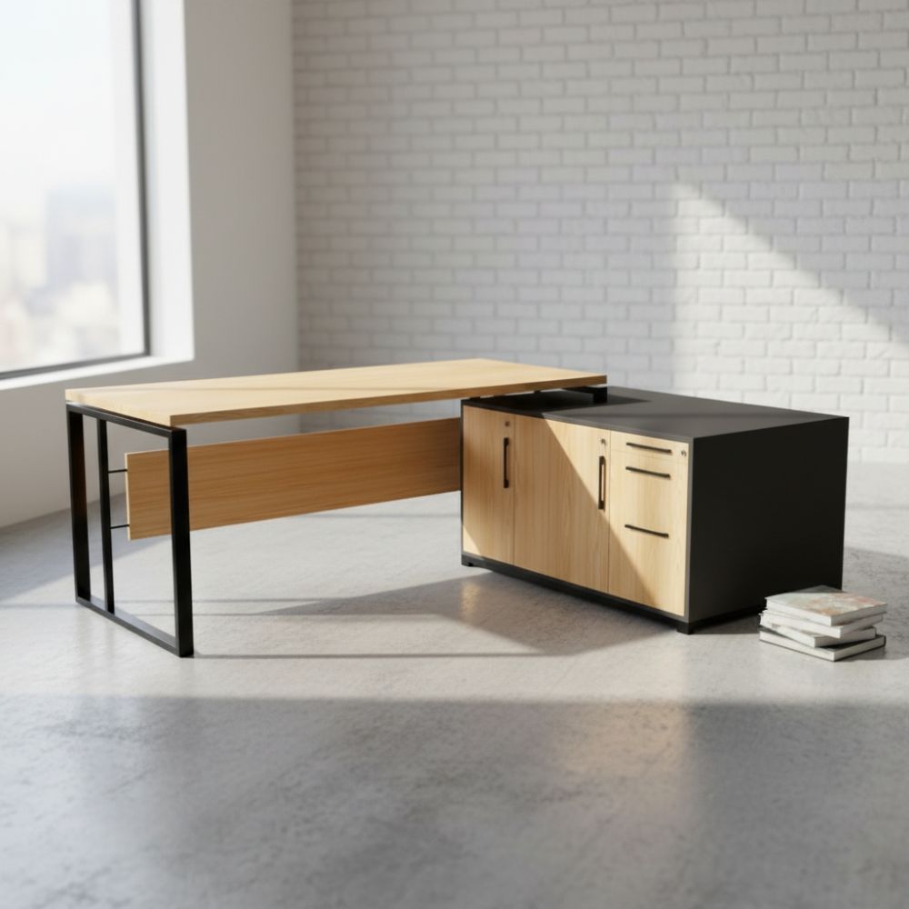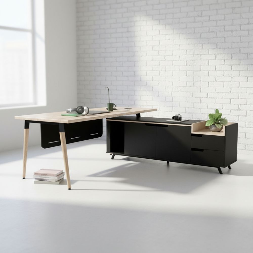 32mm Melamine Top with 38 x 38mm Steel Underframe and Angled Oak Leg