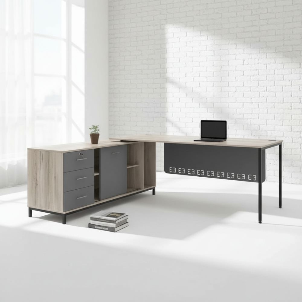 Melamine 32mm tops with 32 x 2mm impact edge. 50mm steel epoxy frame.