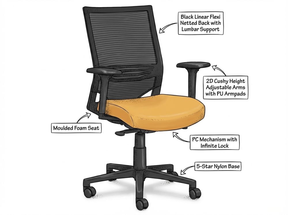 The Fineline range is engineered for dependable performance in commercial environments. Its netted back reduces maintenance, while modular components allow dealers and project teams to adapt the chair to both budget and aesthetic needs.