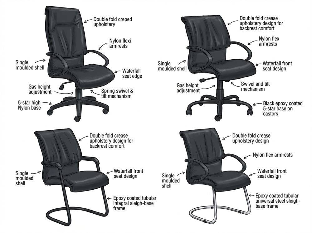 | Chair Type | High Back, Mid Back, Arm Chair, Integral |