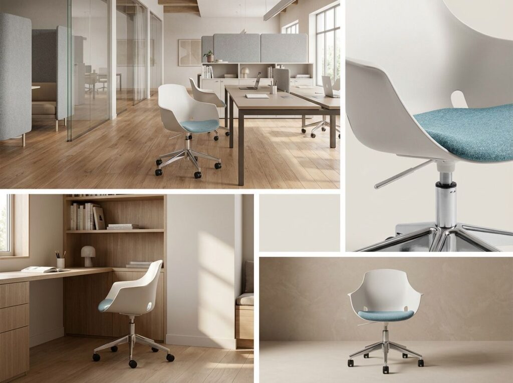 Polyprop shell on 5 star castor base (polished Aluminium or Black nylon) with swivel and gas lift. Available with optional upholstered seat panel.