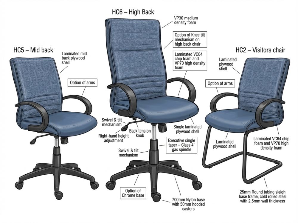 | Chair Type | High Back, Mid Back, Side Chair |