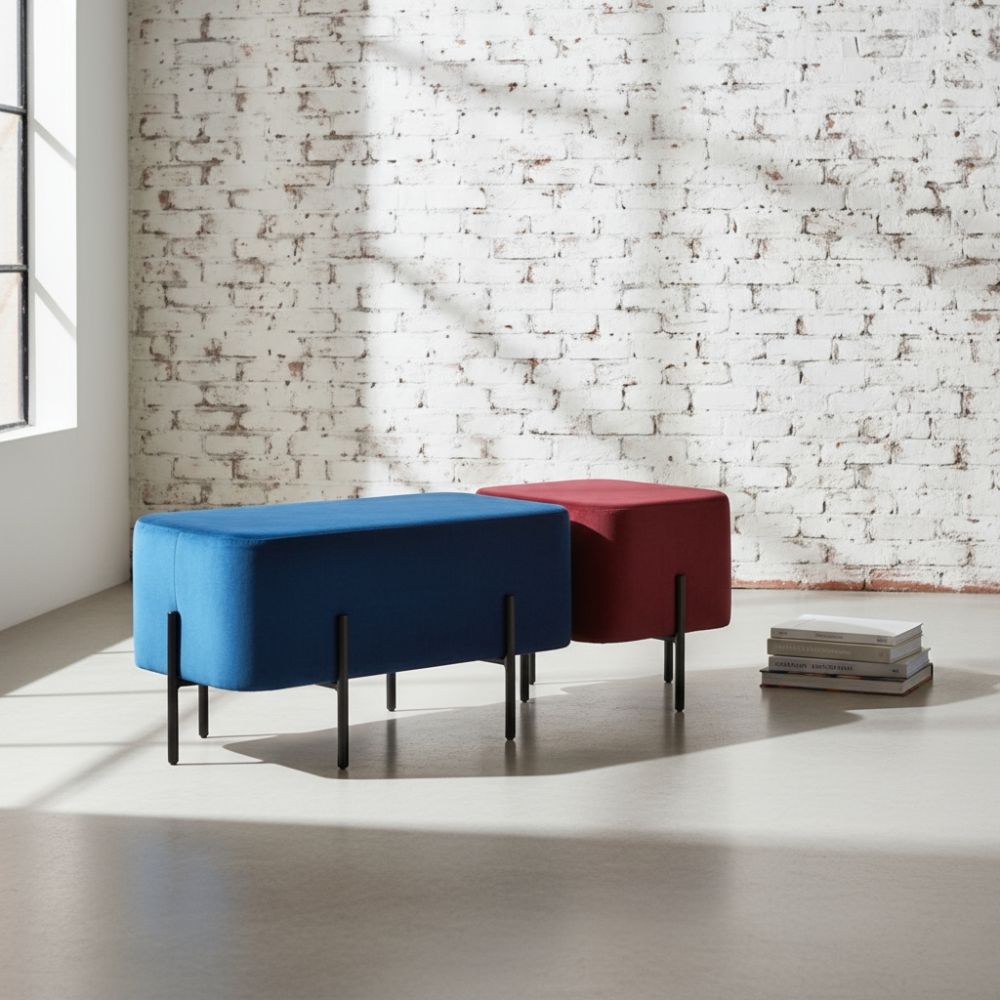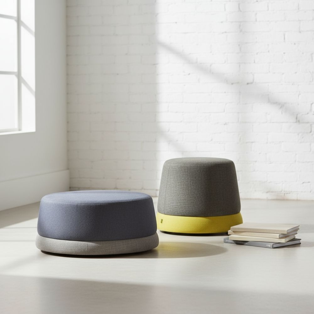 An organically shaped upholstered ottoman available in two sizes. A multi-directional stretch fabric is required for upholstery.