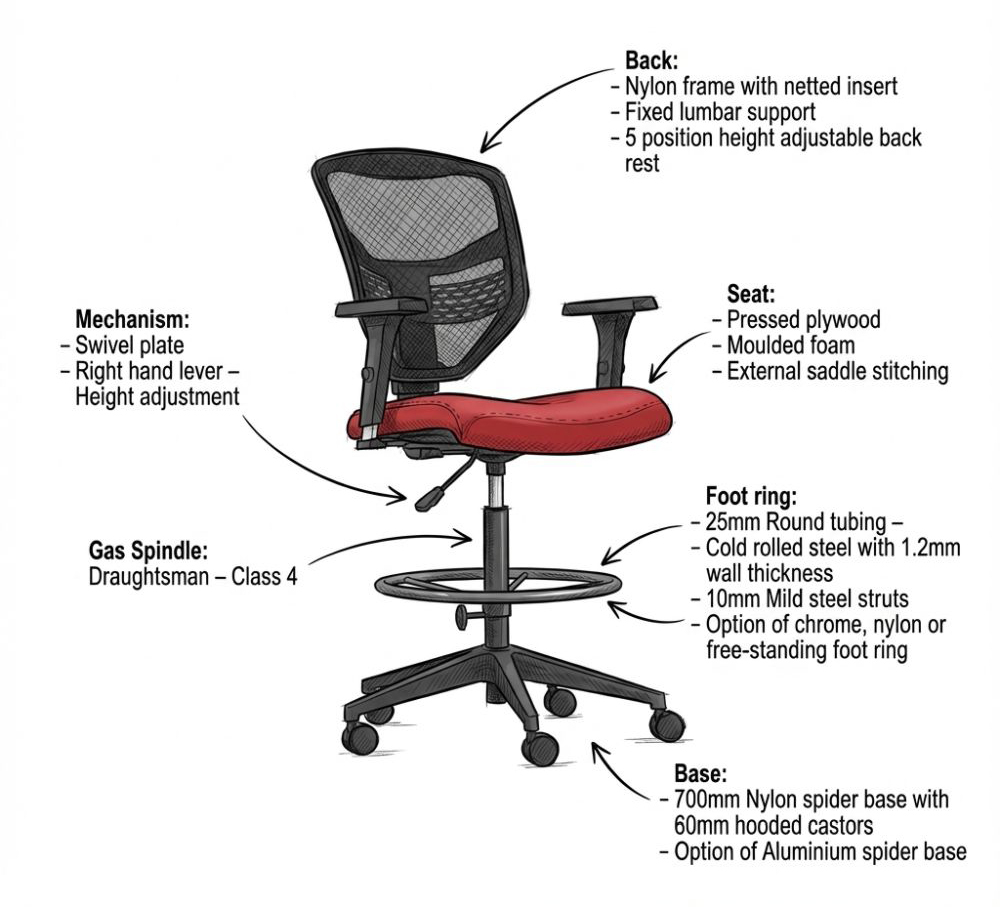 Base: 700mm Nylon base with 50mm hooded castors. Option of Chrome base.