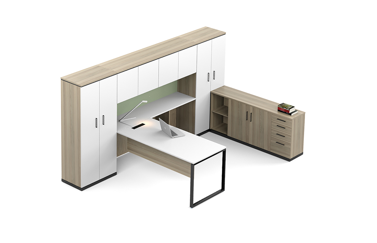 Executive two x hinge-door cabinets, executive worktop, overhead storage in glass or wood with pinboard and executive pedenza cabinet.