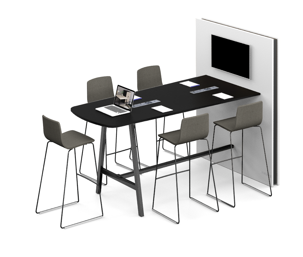 For a more formal collaborative setting, pair a Simply low table with Simply angled legs, attached to a media wall on one end that can accommodate a larger screen.