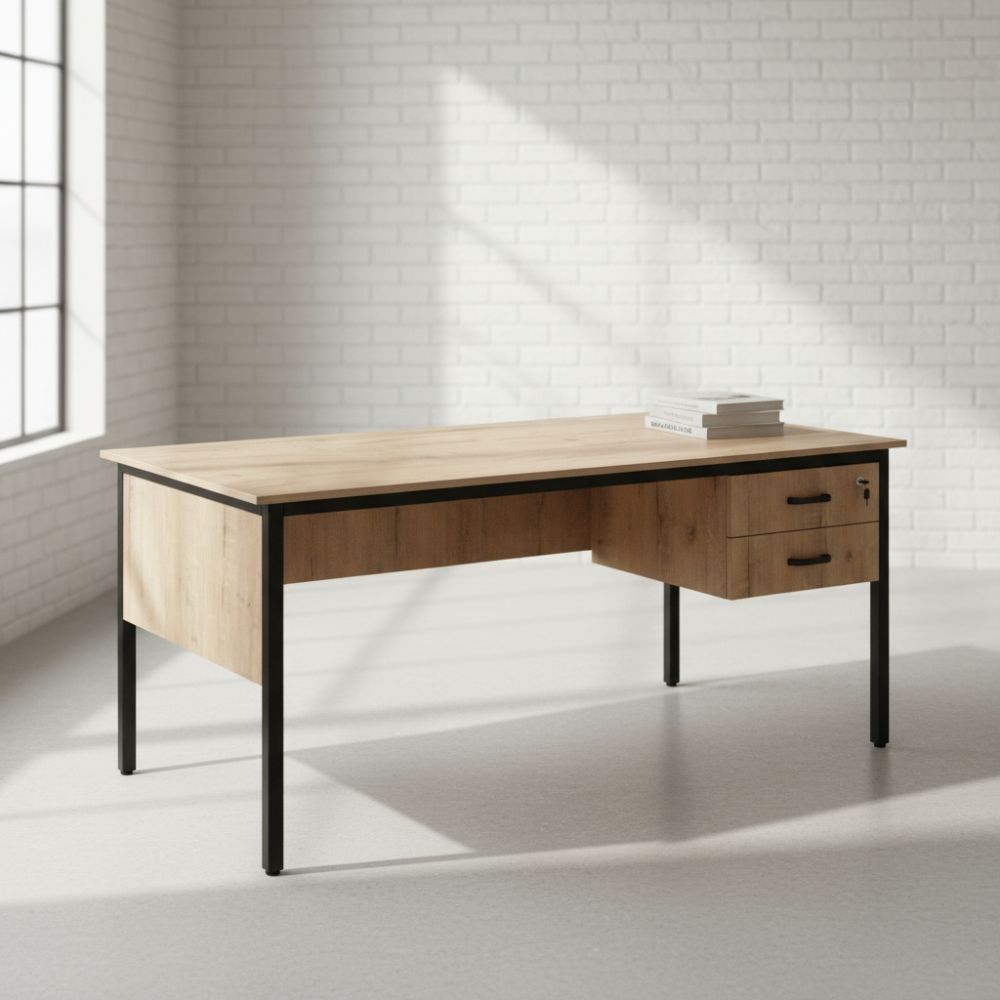 Durable desk constructed with a 32mm square cold-rolled steel frame for strength and stability, paired with 16mm melamine top and modesty panels finished with 1mm PVC edging. Includes drawers with melamine fronts and sides, smooth steel runners, and a lockable top drawer for secure storage.