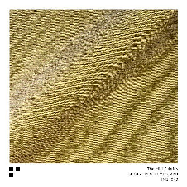 “SHOT” is the description of a fabric surface effect created by weaving two different coloured yarns together, one colour in the opposite direction to the other, showing a striking contrast between the two. The Mill’s Chartreuse Yellow base weave shines through each and every one of our exciting 30 colourways, giving a special glow similar to a traditional Silk Taffeta.